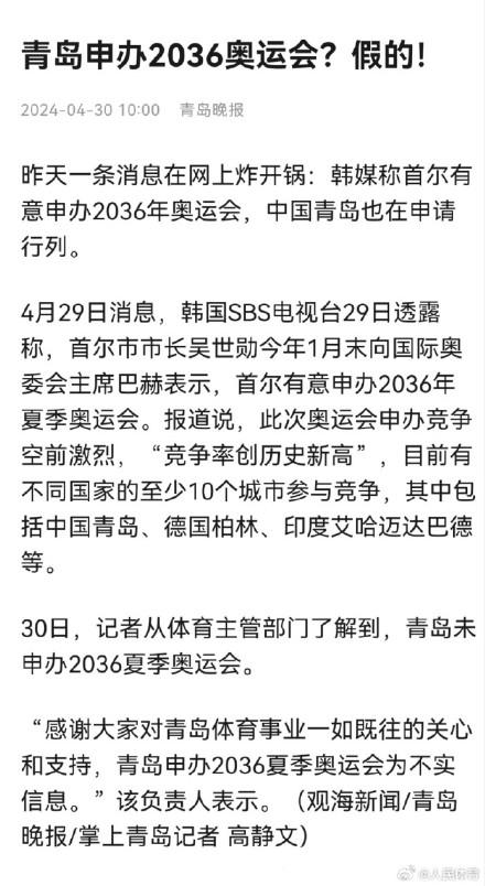 近日,有韩国媒体消息称,2036年奥运会的申办竞争异常激烈,包括中国青岛、韩国首尔、印度新德里、土耳其伊斯坦布尔、德国柏林、卡塔尔多哈、丹麦哥本哈根等城市均有意。但在北京时间4月30日,国内媒体记者从体育主管部门了解到,青岛未申办2036年夏季奥运会。