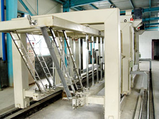 河南豫晖矿山机械有限公司生产的分步移动式切割机 翻转吊具把模具空中翻90度后脱模把坯体连同模具侧板放置在切割台上,纵向切割装置通过电机带动自身行走,对放置于切割台上的坯体进行纵向切割,切割完成后行走至暂停位置,横向切割装置通过电机带动自身行走到坯体中央停止后,横切架自上而下垂直降落切割直至上升复位。
