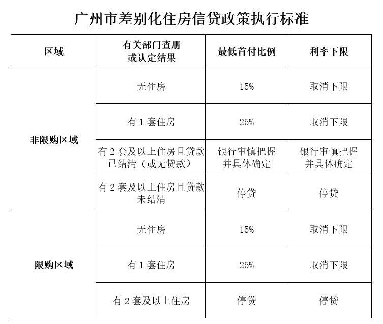 5月28日,广州市政府办公厅印发《关于进一步促进我市房地产市场平稳健康发展的通知》,对住房限购政策、住房信贷政策、住房套数认定等进一步优化。南都湾财社记者从人民银行广东省分行获悉,同日广州市差别化住房信贷政策进行调整,包括限购和非限购区域首、二套住房均取消利率下限,首、二套房最低首付比例均分别下调至15%、25%。