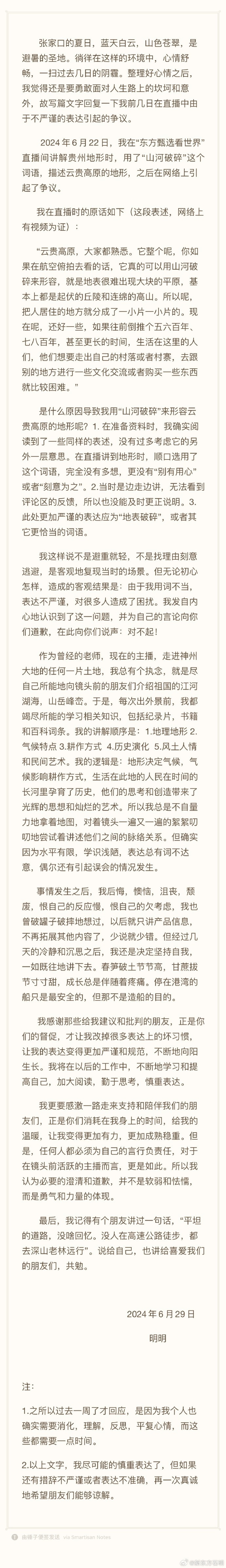 新东方旗下东方甄选主播明明(石明)6月29日在微博回应日前直播中用“山河破碎”描述贵州地形引发的争议。他表示,在准备资料时确实阅读到了一些同样的表述,没有过多考虑它的另外一层意思,在直播讲到地形时,顺口选用了这个词语,完全没有多想,更没有“别有用心”或者“刻意为之”;当时是边走边讲,无法看到评论区的反馈,所以也没能及时更正说明,此处更加严谨的表达应为“地表破碎”,或者其它更恰当的词语。他称,由于用词不当表达不严谨对很多人造成的困扰,其向公众致歉。