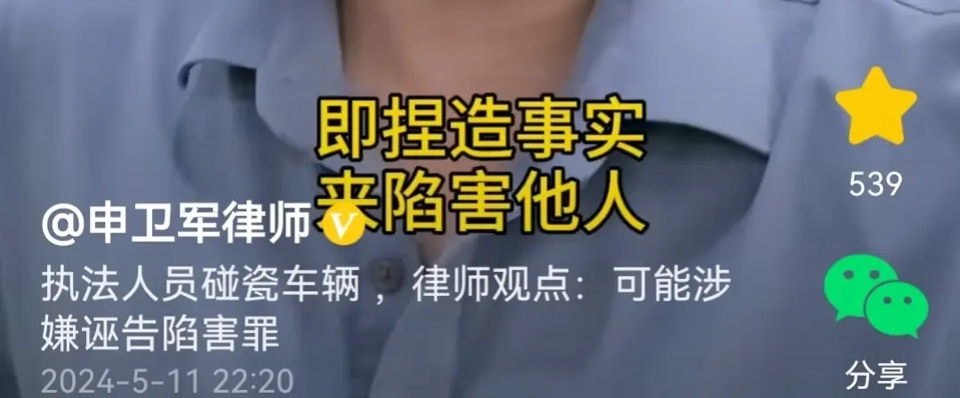 对此,专业律师评论到执法人员明知道执行公务时,如果对方以驾驶机动车撞击暴力抗拒执法,车主就会构成妨害公务罪。然而,他还故意营造这样的事故现场,根据刑法第二百四十三条所规定,很有可能构成诬告陷害罪,即捏造事实来陷害他人,意图使他人受到刑事追究。