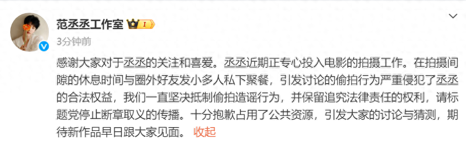 搜狐娱乐讯 16日,一段范丞丞与买超聚餐的视频曝光,视频中范丞丞和一位女生互动亲密引发恋情猜测。对此,范丞丞工作室发文回应,称范丞丞只是在休息间隙和好友发小聚餐,十分抱歉占用了公共资源,引发大家的讨论与猜测,期待新作品早日跟大家见面。