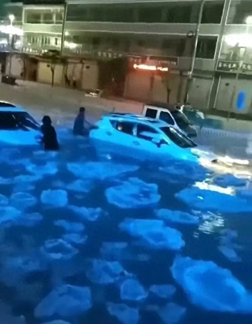傍晚,天空骤然阴沉,狂风大作,随即雷声隆隆,冰雹倾盆而下。这不是普通的冰雹,而是足有鸡蛋大小的冰块,有些甚至直径达30-40厘米,就像一枚枚小型炸弹从天而降。巨大的冰雹噼里啪啦地砸在地面、车辆和房屋上,发出骇人的巨响。只消数分钟,马路、广场就被厚厚的冰层覆盖,车辆无法行驶,市民赶忙躲进房屋或商铺,生怕被击中而受伤。