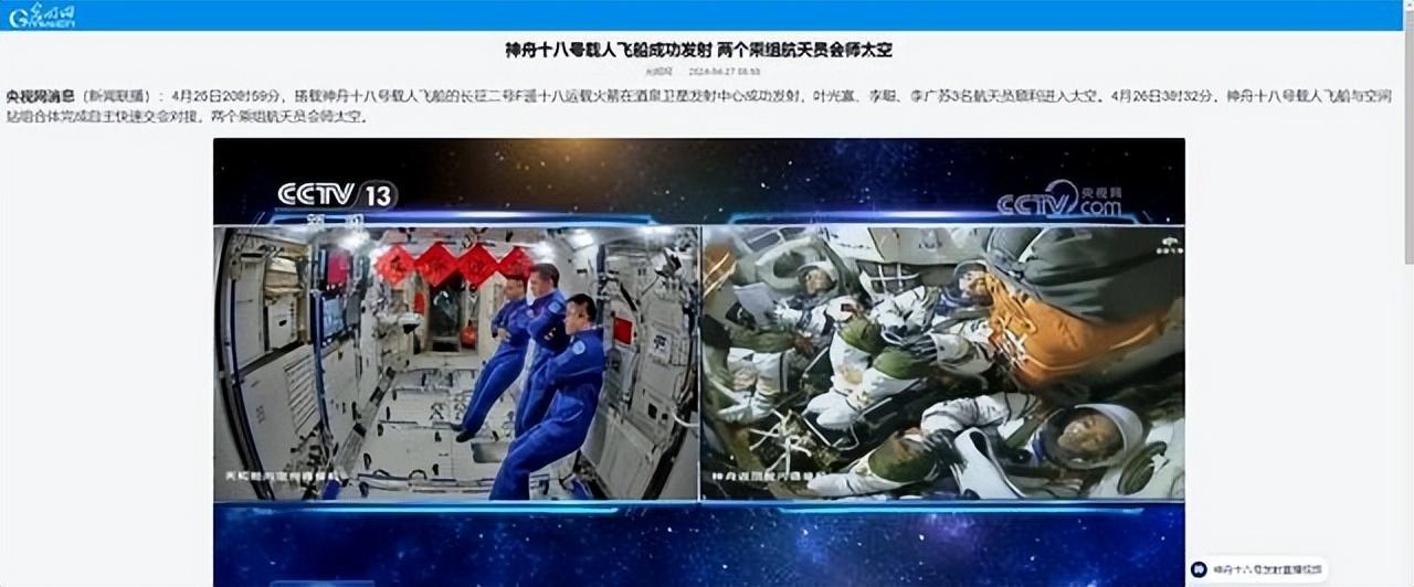 今年的4月25日,神舟十八号载人飞船承载着国家期望和民族荣誉成功升空,开启了对星辰大海的再次探索。经过严密的轨道调整和精确操作,神舟十八号于4月26日凌晨3时32分成功与中国空间站天和核心舱径向端口完成对接,顺利实现了与天宫空间站的精确接驳。